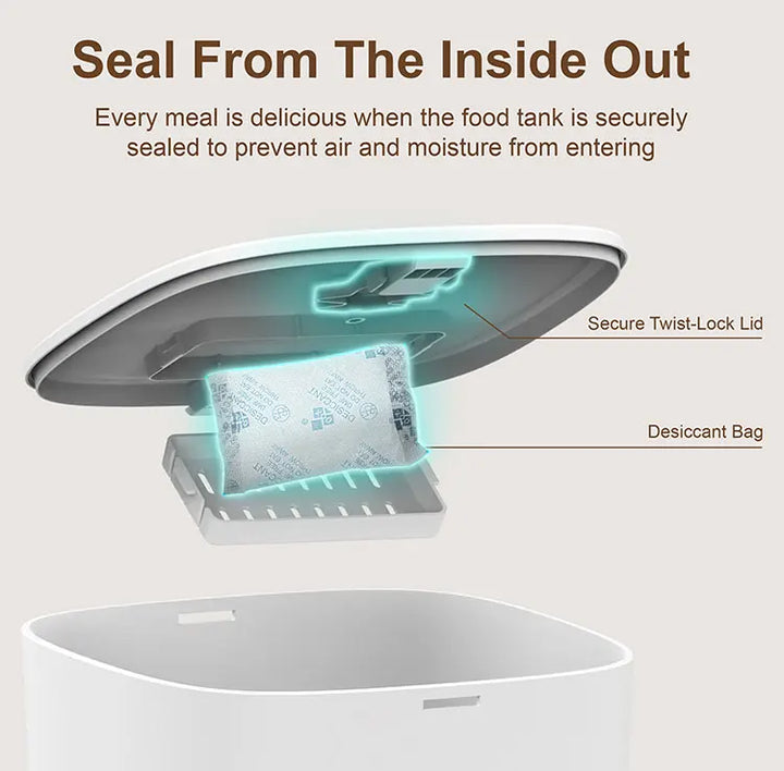 Its stainless-steel bowl, airtight lid, and desiccant cartridge keep food fresh and hygienic. Dual-power operation (plug-in + battery backup) ensures your pet never misses a meal — even during power interruptions.