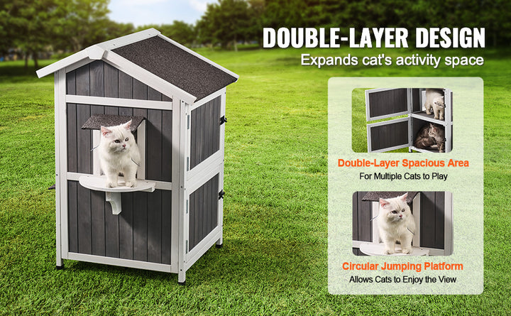 The double-layer design offers plenty of space for up to four cats to relax, sleep, or play. The sloped asphalt roof prevents water buildup, while PVC door flaps and rainproof eaves keep out wind, rain, and snow. A raised base with waterproof foot pads ensures the interior stays dry, even in wet conditions.