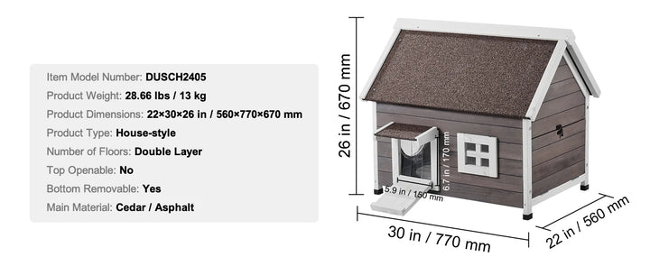 The asphalt sloped roof and raised waterproof feet protect against rain, snow, and moisture, while PVC door flaps and dual acrylic windows provide ventilation and visibility. The side door and removable floor make cleaning quick and effortless, ensuring a fresh, tidy space for your feline companions.