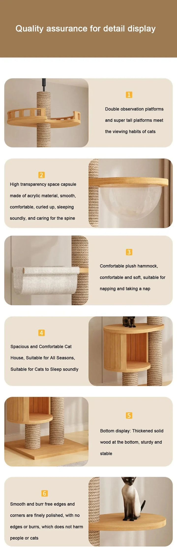 The sturdy pine wood base and reinforced posts ensure stability, even for multiple cats at once. With an adjustable height range, it fits most standard ceilings without drilling, making setup quick and easy.