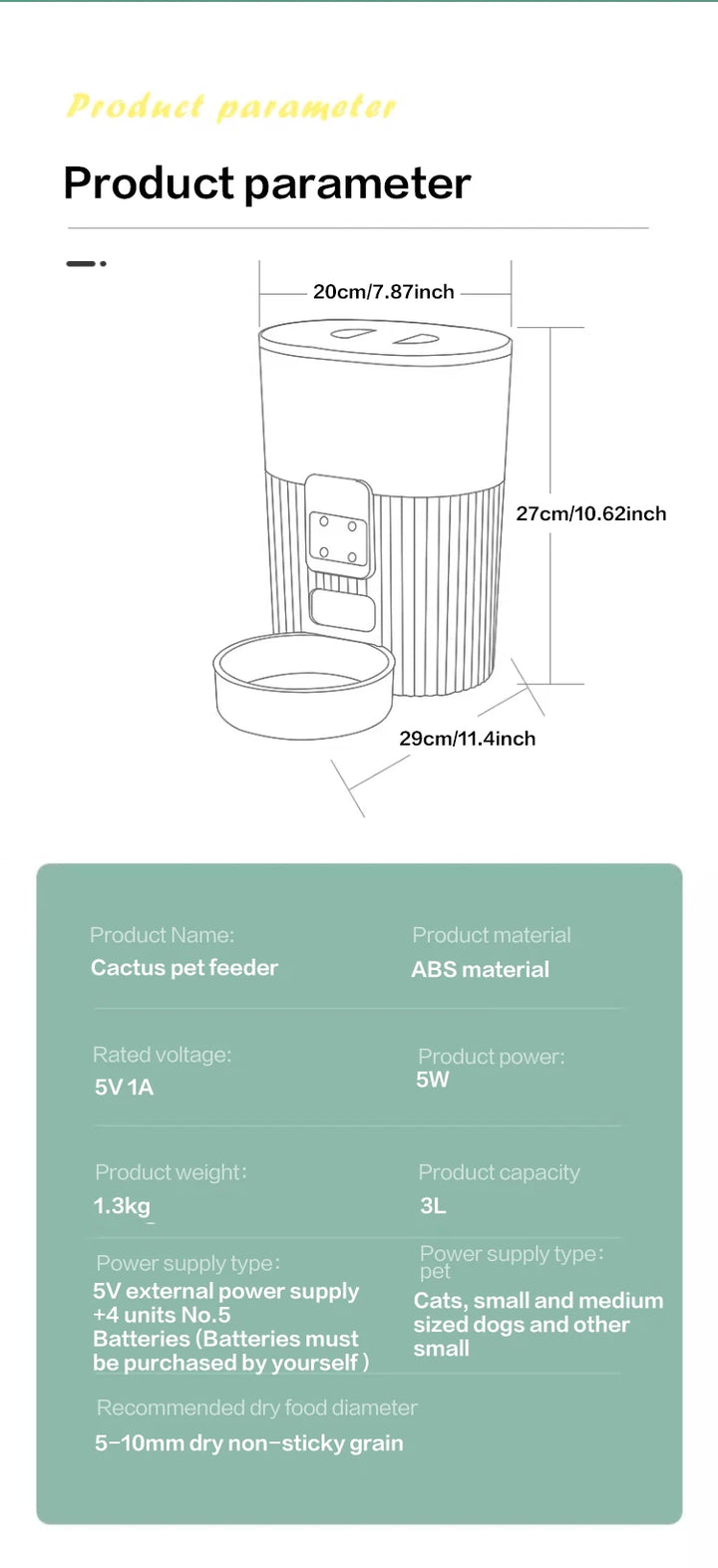 With a large capacity (up to 2000g of dry food), the feeder can be programmed to dispense anywhere from 50g to 2000g per meal, making it ideal for single or multi-pet households. The clear LCD display allows for easy setup, while the anti-jam design ensures smooth food dispensing.