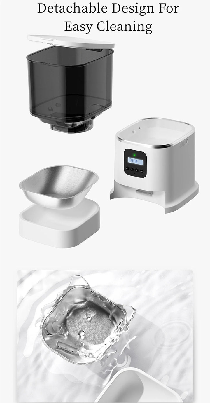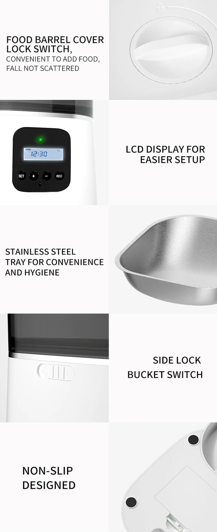 With a 3L food capacity, the feeder supports up to 39 portions per meal (about 5g each), and can be programmed for multiple feedings per day. Depending on the model, it includes an LCD control panel or WiFi app control (with or without camera) for full remote management. The built-in voice recorder lets you play a 10–30 second message to call your pets to their food, providing comfort even when you’re away.