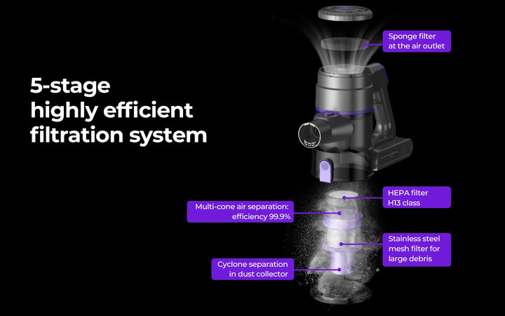 Dual HEPA + multi-cyclonic filtration traps allergens and fine dust.