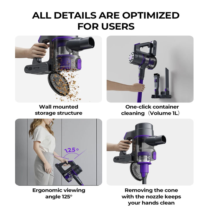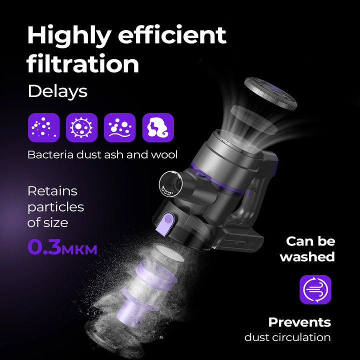 The lightweight design works as both a stick vacuum and a handheld, allowing you to easily switch between floors, furniture, and car interiors. Its advanced 4-stage multi-cyclonic filtration system and dual HEPA filters capture fine dust, allergens, and pet dander, improving air quality while protecting your family’s health.