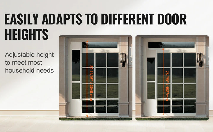 Built with a sturdy aluminum frame and tempered glass panel, this pet door withstands harsh weather and heavy use. Its adjustable height range (75 ⅞"–80 11⁄16") ensures a perfect fit for standard and custom doorways, while the metal locking cover adds an extra layer of security when you’re away.