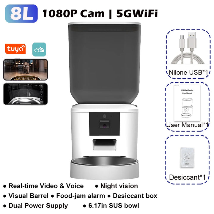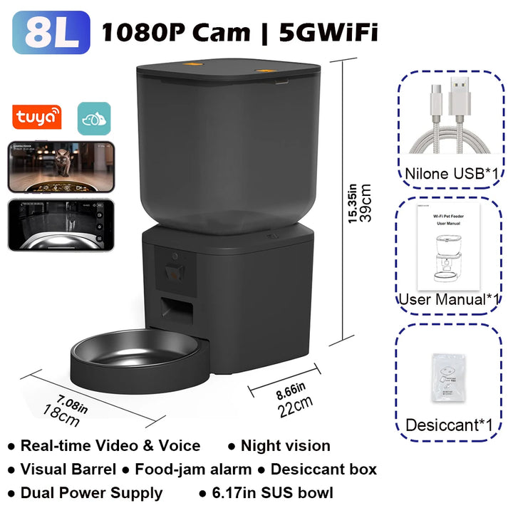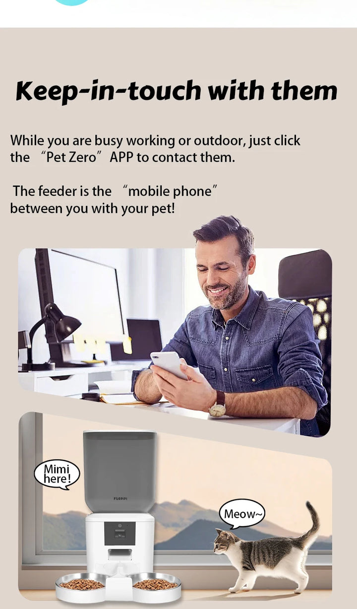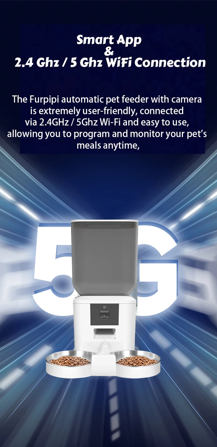 Connected via 2.4GHz / 5GHz WiFi, the feeder works with the Pet Zero or Tuya app to let you schedule feedings, adjust portions, and monitor your pet remotely. The built-in 1080p camera with night vision and two-way audio allows you to see, hear, and talk to your pets anytime, while AI motion capture sends alerts when your furry friend is nearby.