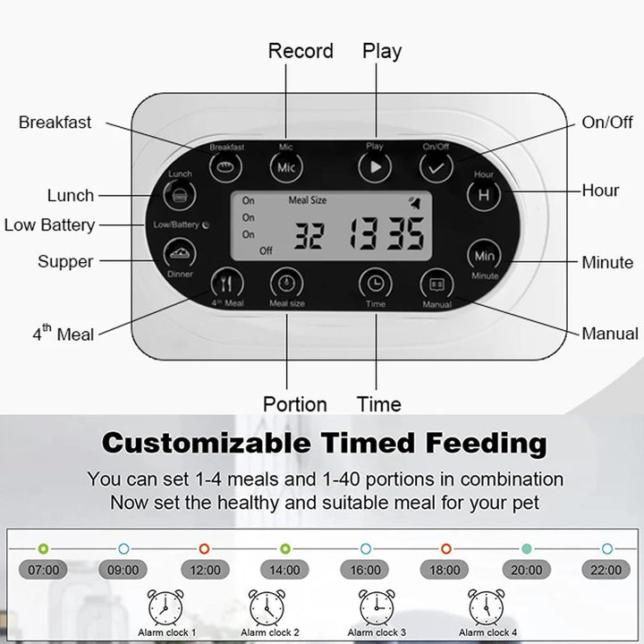 Smart scheduling: Dispense up to 4 meals daily with 1–20 portion control.