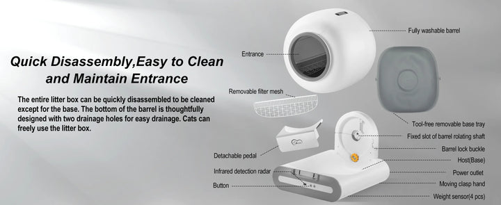 Built-in infrared and weight sensors detect movement instantly, pausing the cycle when your cat approaches for complete safety. The system automatically cleans and separates waste after each use, reducing odors and saving time. Compatible with tofu, mixed, bentonite, and mineral clumping litter.