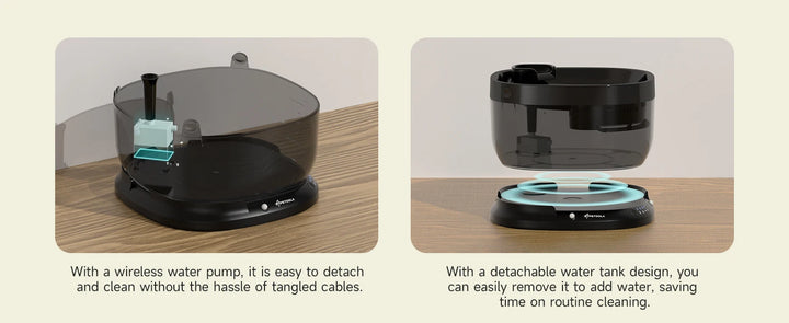 The intelligent pump automatically pauses when water runs low to prevent damage and reduce maintenance. With a removable tank, drain valve, and wireless water pump, cleaning takes just minutes.